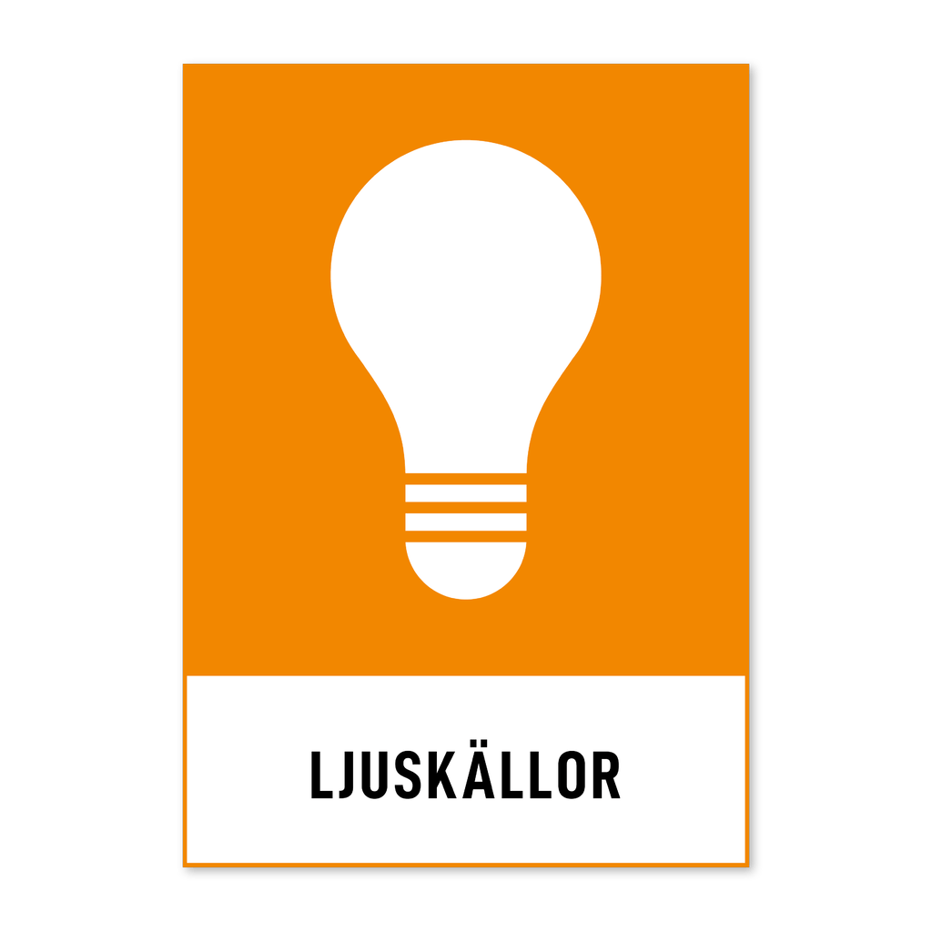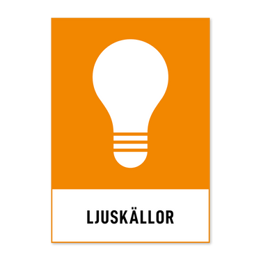 Skylt med texten Ljuskällor. Skylten finns i aluminium (plan), plast, klisterdekal och som kantvikt aluminium för stolpmontage. Möjlighet finns att lägga till dubbelhäftande tejp eller skruvhål som fästmetod på skyltarna i aluminium (plan) och plast.