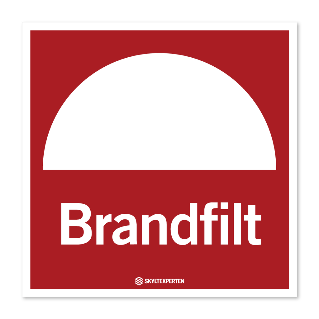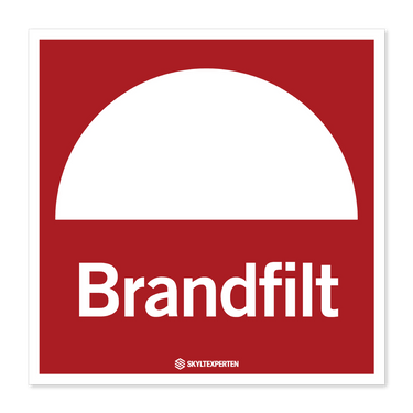 Skylt med texten Brandfilt. Skylten finns i aluminium (plan), plast, klisterdekal och som kantvikt aluminium för stolpmontage. Möjlighet finns att lägga till dubbelhäftande tejp eller skruvhål som fästmetod på skyltarna i aluminium (plan) och plast.