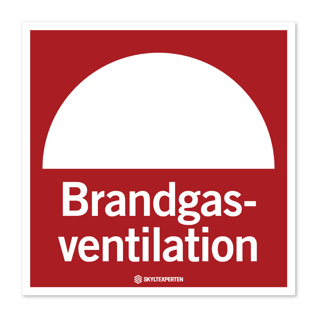 Skylt med texten Brandgasventilation. Skylten finns i aluminium (plan), plast, klisterdekal och som kantvikt aluminium för stolpmontage. Möjlighet finns att lägga till dubbelhäftande tejp eller skruvhål som fästmetod på skyltarna i aluminium (plan) och plast.