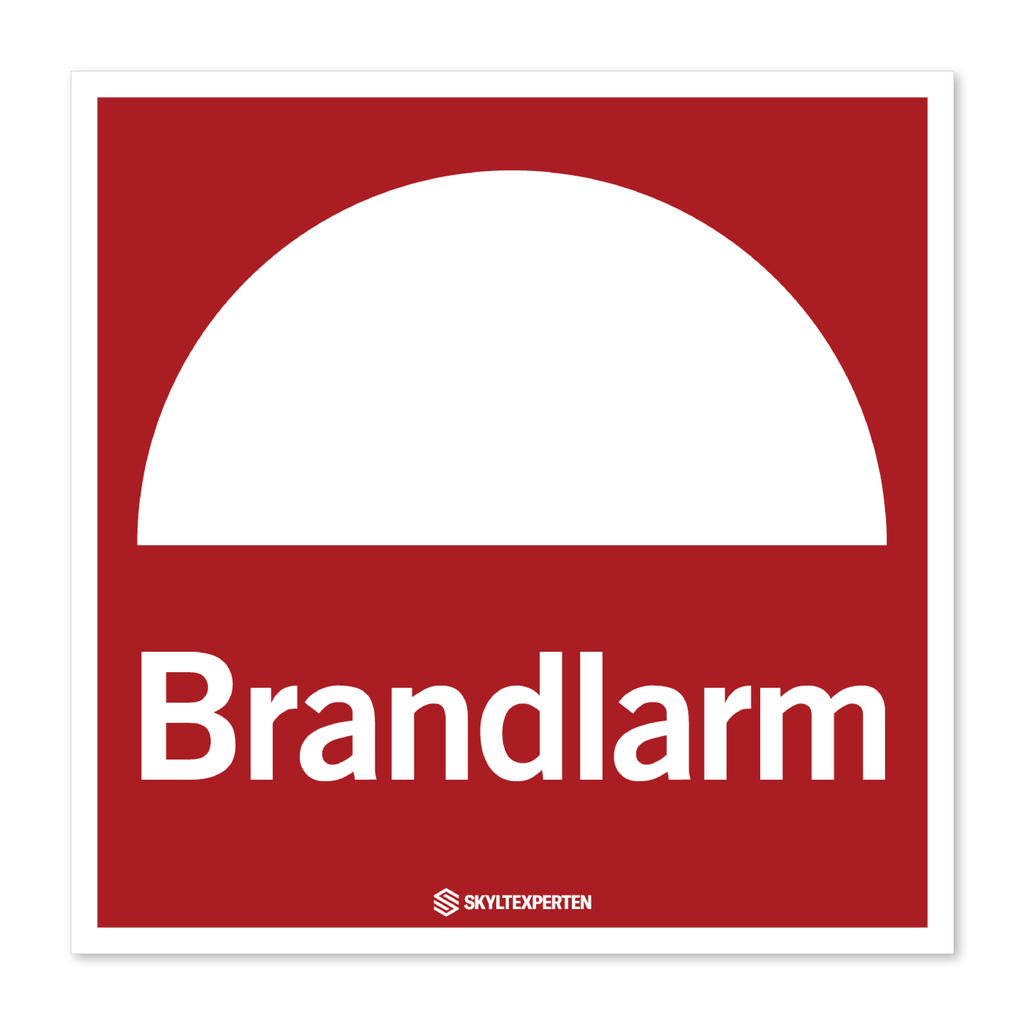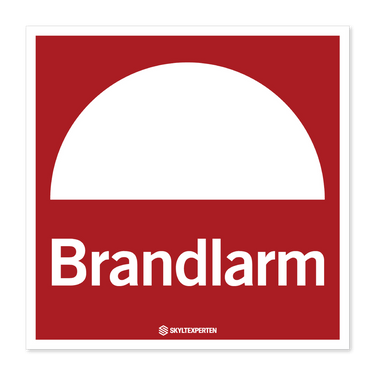 Skylt med texten Brandlarm. Skylten finns i aluminium (plan), plast, klisterdekal och som kantvikt aluminium för stolpmontage. Möjlighet finns att lägga till dubbelhäftande tejp eller skruvhål som fästmetod på skyltarna i aluminium (plan) och plast.