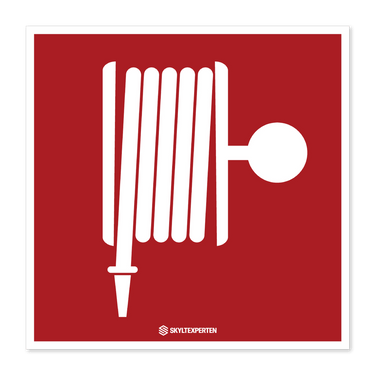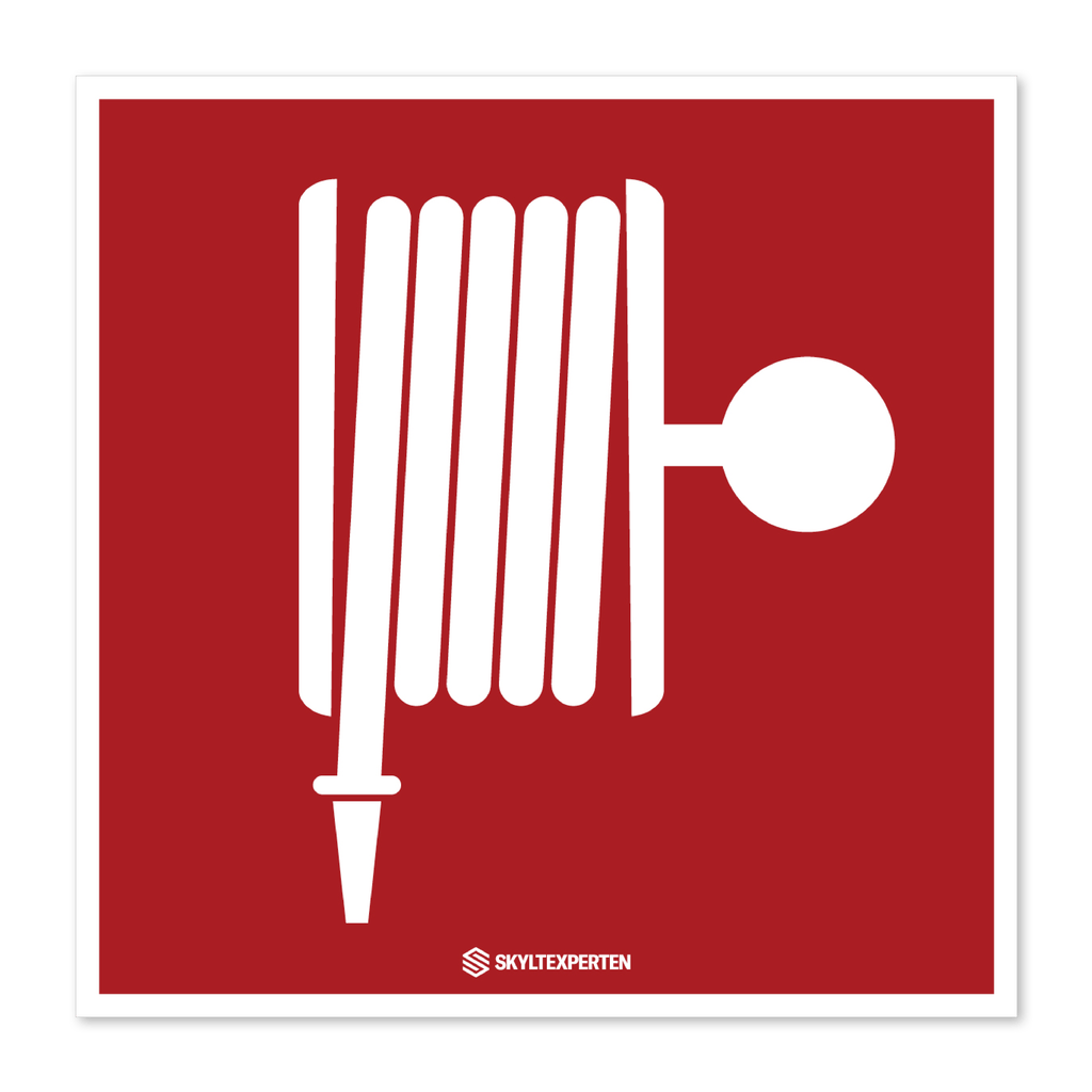 Skylt med symbol av en Brandslang. Skylten finns i aluminium (plan), plast, klisterdekal och som kantvikt aluminium för stolpmontage. Möjlighet finns att lägga till dubbelhäftande tejp eller skruvhål som fästmetod på skyltarna i aluminium (plan) och plast.