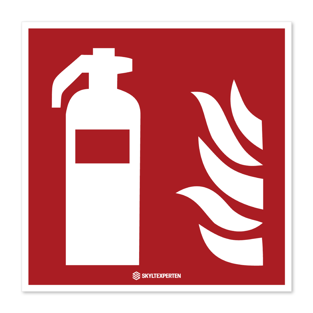 Skylt med symbolen F001 Brandsläckare enligt standarden ISO 7010. Skylten finns i aluminium (plan), plast, klisterdekal och som kantvikt aluminium för stolpmontage. Möjlighet finns att lägga till dubbelhäftande tejp eller skruvhål som fästmetod på skyltarna i aluminium (plan) och plast.