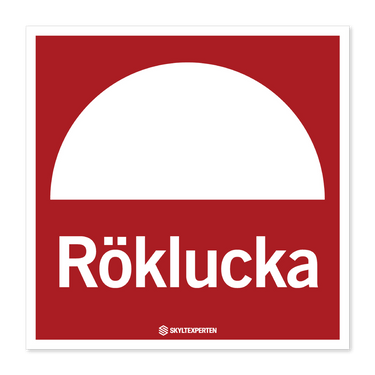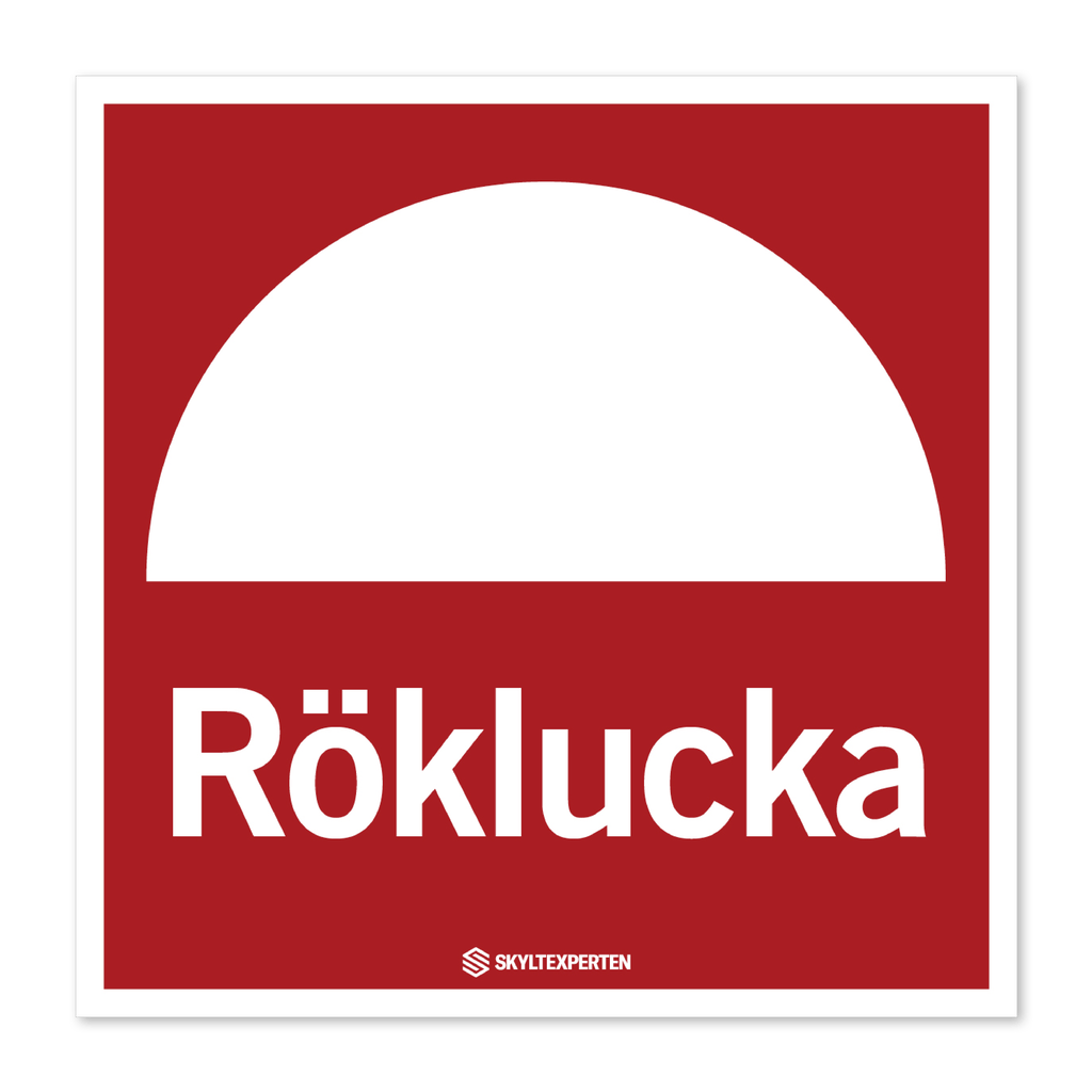 Skylt med texten Röklucka. Skylten finns i aluminium (plan), plast, klisterdekal och som kantvikt aluminium för stolpmontage. Möjlighet finns att lägga till dubbelhäftande tejp eller skruvhål som fästmetod på skyltarna i aluminium (plan) och plast.