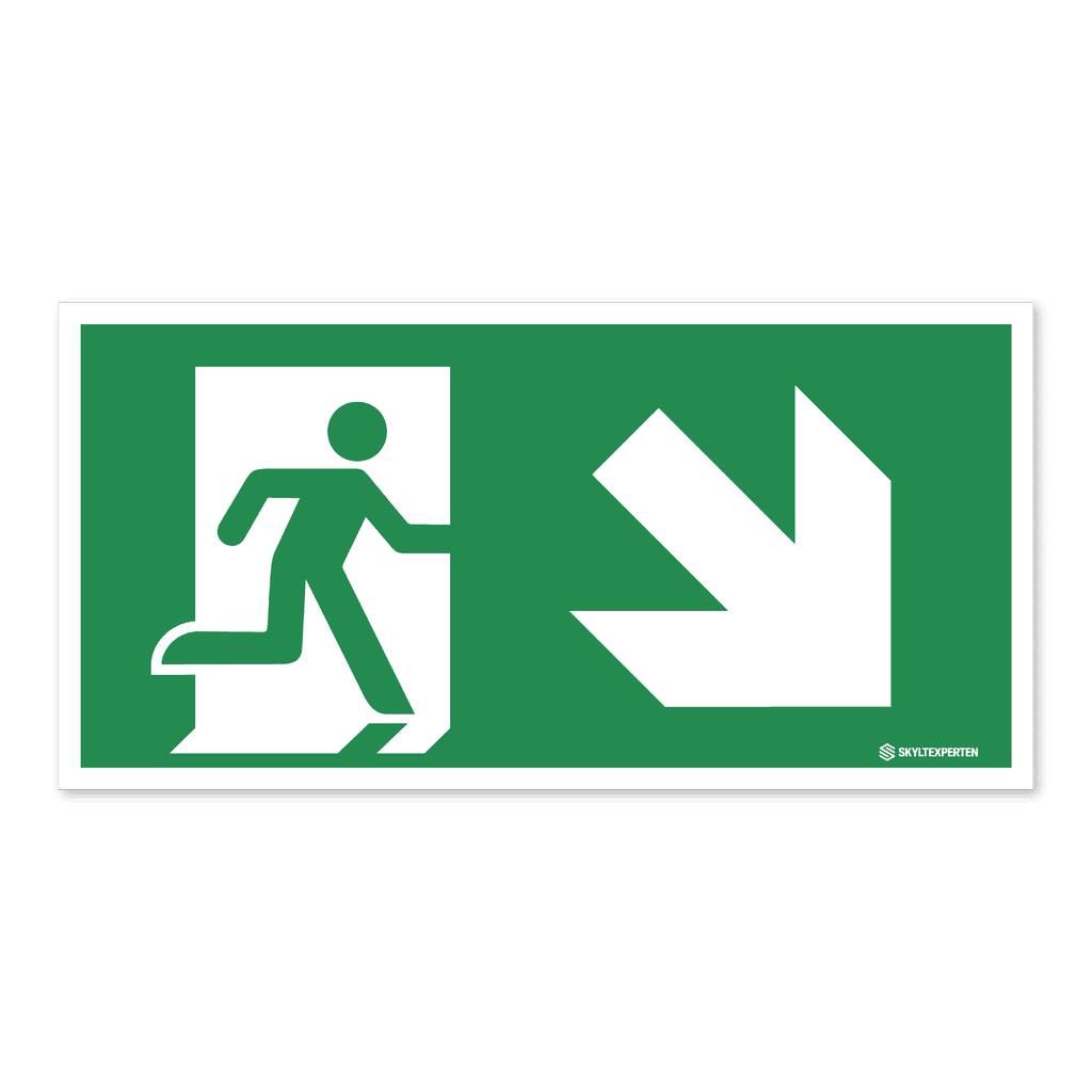 Skylt med nödutgångssymbol och pil som pekar snett nedåt åt höger. Skylten finns i aluminium (plan), plast, klisterdekal och som kantvikt aluminium för stolpmontage. Möjlighet finns att lägga till dubbelhäftande tejp eller skruvhål som fästmetod på skyltarna i aluminium (plan) och plast.