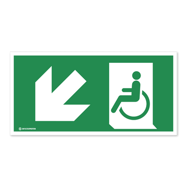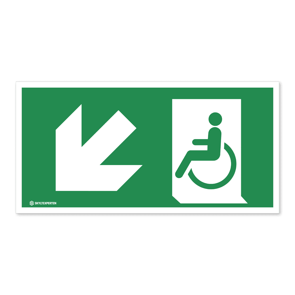Nödutgångsskylt med rullstolssymbol – Pil snett ned vänster