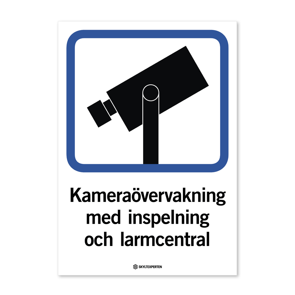 Skylt med texten Kameraövervakning med inspelning och larmcentral. Skylten finns i aluminium (plan), plast, klisterdekal och som kantvikt aluminium för stolpmontage. Möjlighet finns att lägga till dubbelhäftande tejp eller skruvhål som fästmetod på skyltarna i aluminium (plan) och plast.