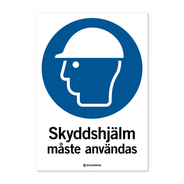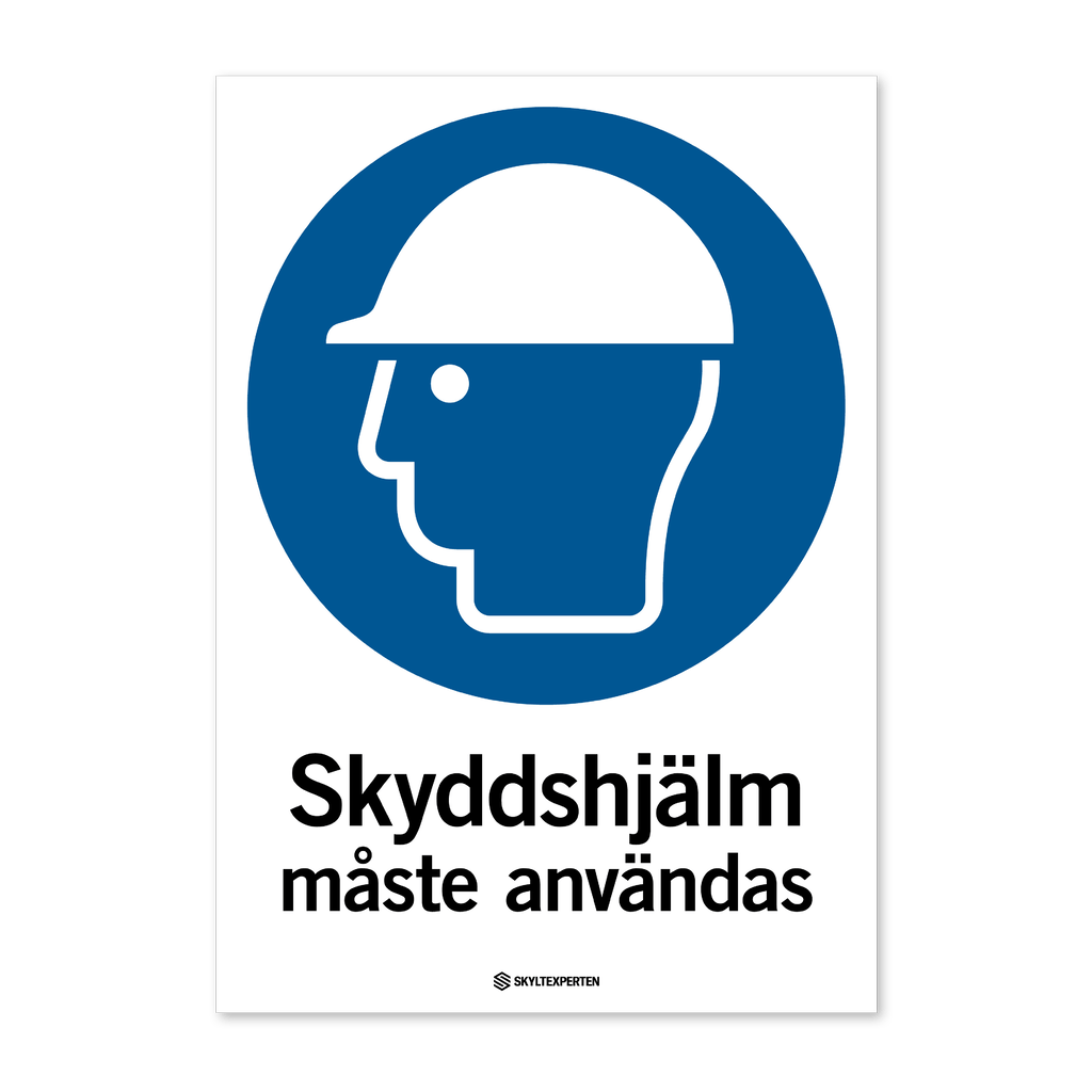 Skylt med texten Skyddshjälm måste användas. Skylten finns i aluminium (plan), plast, klisterdekal och som kantvikt aluminium för stolpmontage. Möjlighet finns att lägga till dubbelhäftande tejp eller skruvhål som fästmetod på skyltarna i aluminium (plan) och plast.