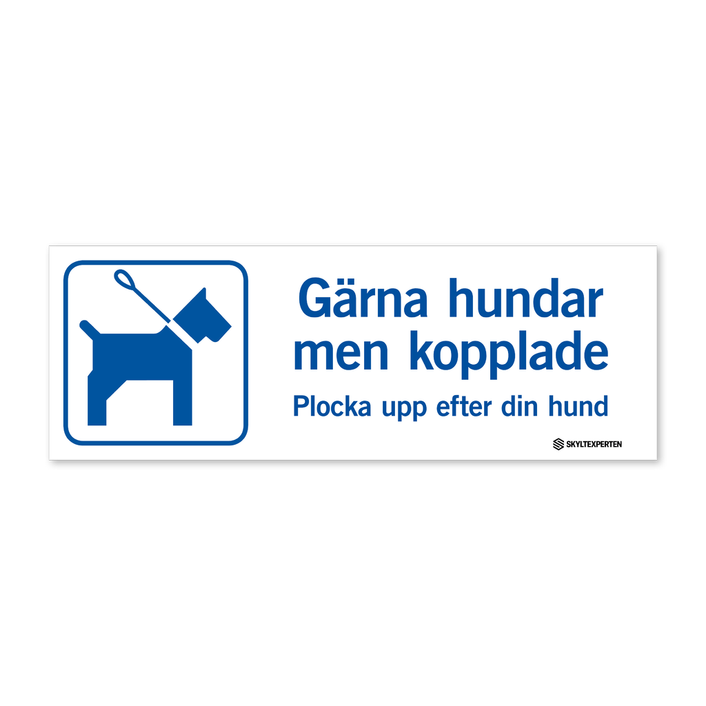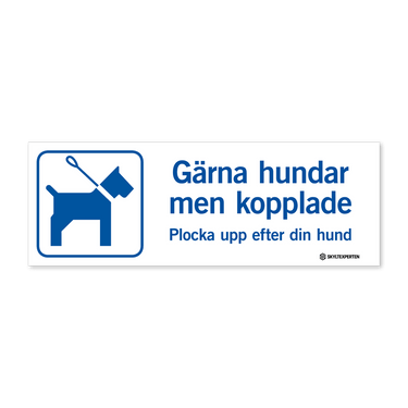 Skylt med texten Gärna hundar men kopplade – Plocka upp efter din hund. Skylten finns i aluminium (plan), plast, klisterdekal och som kantvikt aluminium för stolpmontage. Möjlighet finns att lägga till dubbelhäftande tejp eller skruvhål som fästmetod på skyltarna i aluminium (plan) och plast.