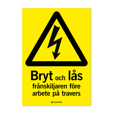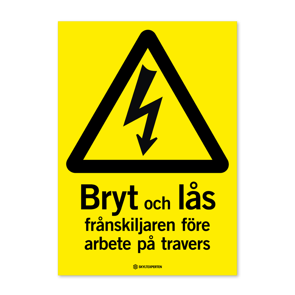 Skylt med texten Bryt och lås frånskiljaren före arbete på travers. Skylten finns i aluminium (plan), plast, klisterdekal och som kantvikt aluminium för stolpmontage. Möjlighet finns att lägga till dubbelhäftande tejp eller skruvhål som fästmetod på skyltarna i aluminium (plan) och plast.