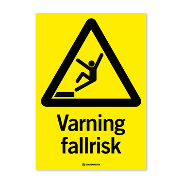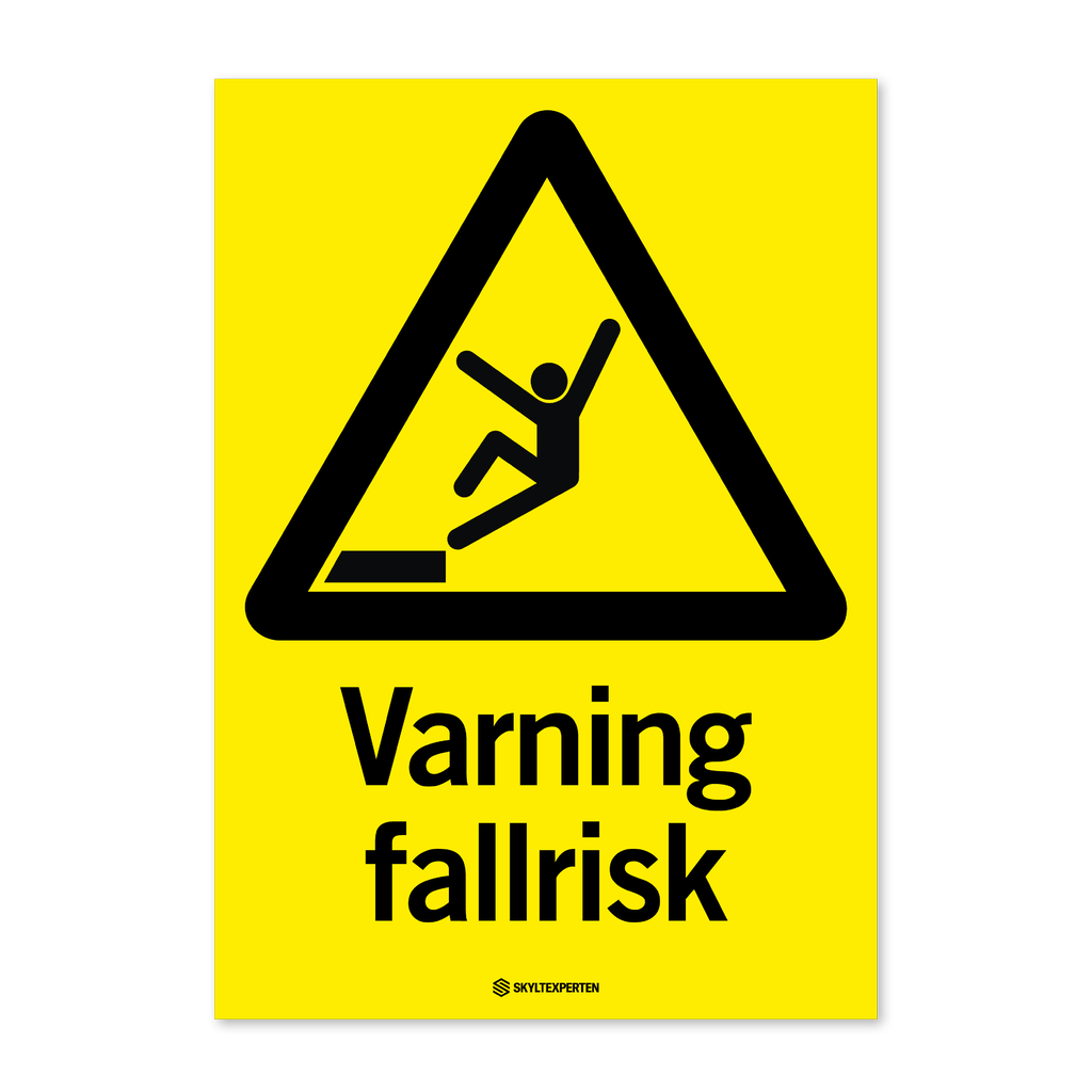 Skylt med texten Varning för fallrisk. Skylten finns i aluminium (plan), plast, klisterdekal och som kantvikt aluminium för stolpmontage. Möjlighet finns att lägga till dubbelhäftande tejp eller skruvhål som fästmetod på skyltarna i aluminium (plan) och plast.
