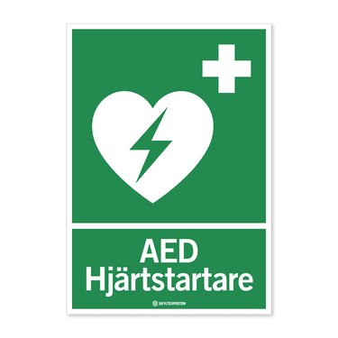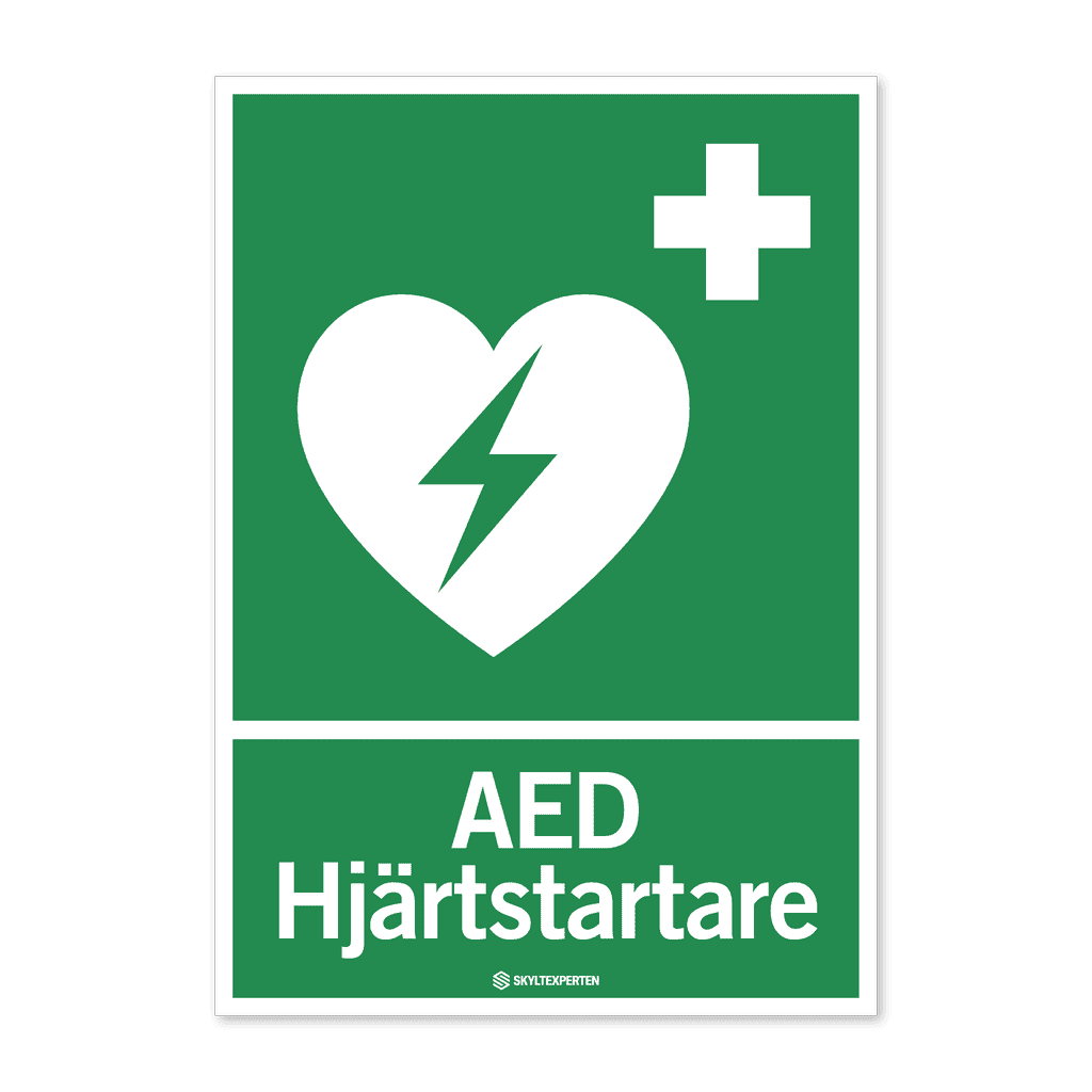 Skylt med texten AED Hjärtstartare. Skylten finns i aluminium (plan), plast, klisterdekal och som kantvikt aluminium för stolpmontage. Möjlighet finns att lägga till dubbelhäftande tejp eller skruvhål som fästmetod på skyltarna i aluminium (plan) och plast.