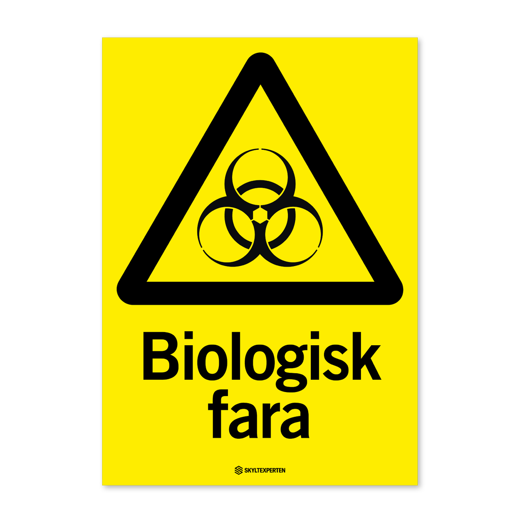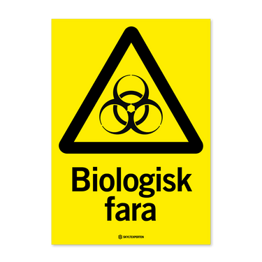 Skylt med texten Biologisk fara. Skylten finns i aluminium (plan), plast, klisterdekal och som kantvikt aluminium för stolpmontage. Möjlighet finns att lägga till dubbelhäftande tejp eller skruvhål som fästmetod på skyltarna i aluminium (plan) och plast.