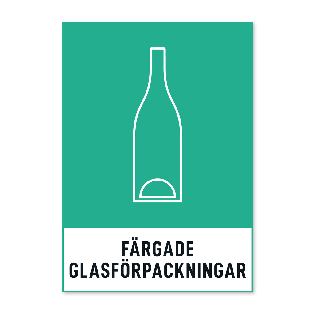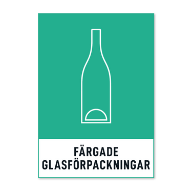 Skylt med texten Färgade glasförpackningar. Skylten finns i aluminium (plan), plast, klisterdekal och som kantvikt aluminium för stolpmontage. Möjlighet finns att lägga till dubbelhäftande tejp eller skruvhål som fästmetod på skyltarna i aluminium (plan) och plast.
