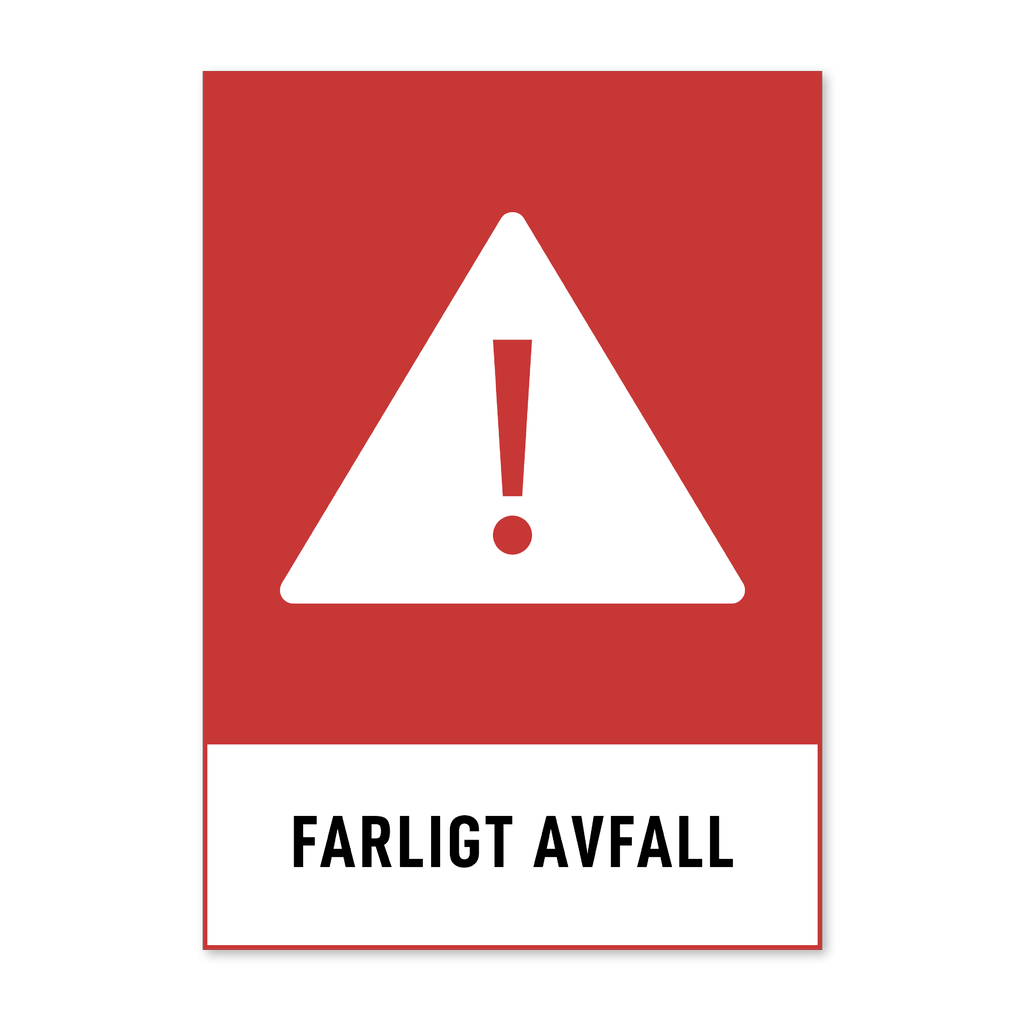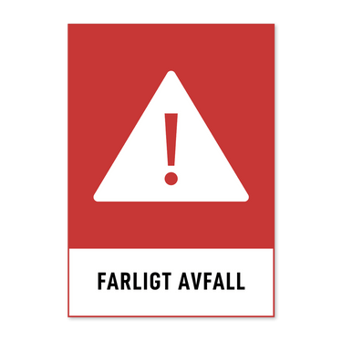 Skylt med texten Farligt avfall. Skylten finns i aluminium (plan), plast, klisterdekal och som kantvikt aluminium för stolpmontage. Möjlighet finns att lägga till dubbelhäftande tejp eller skruvhål som fästmetod på skyltarna i aluminium (plan) och plast.