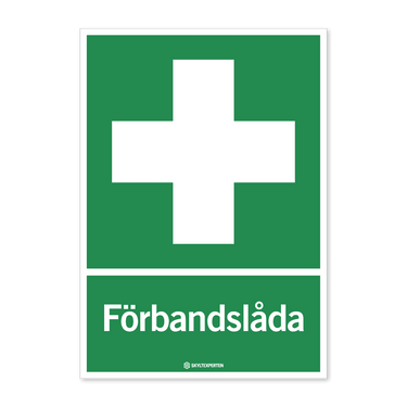 Skylt med texten Förbandslåda. Skylten finns i aluminium (plan), plast, klisterdekal och som kantvikt aluminium för stolpmontage. Möjlighet finns att lägga till dubbelhäftande tejp eller skruvhål som fästmetod på skyltarna i aluminium (plan) och plast.