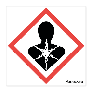 Skylt med symbolen GHS08 Hälsofarlig. Skylten finns i aluminium (plan), plast, klisterdekal och som kantvikt aluminium för stolpmontage. Möjlighet finns att lägga till dubbelhäftande tejp eller skruvhål som fästmetod på skyltarna i aluminium (plan) och plast.