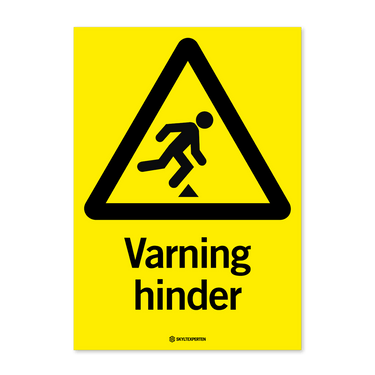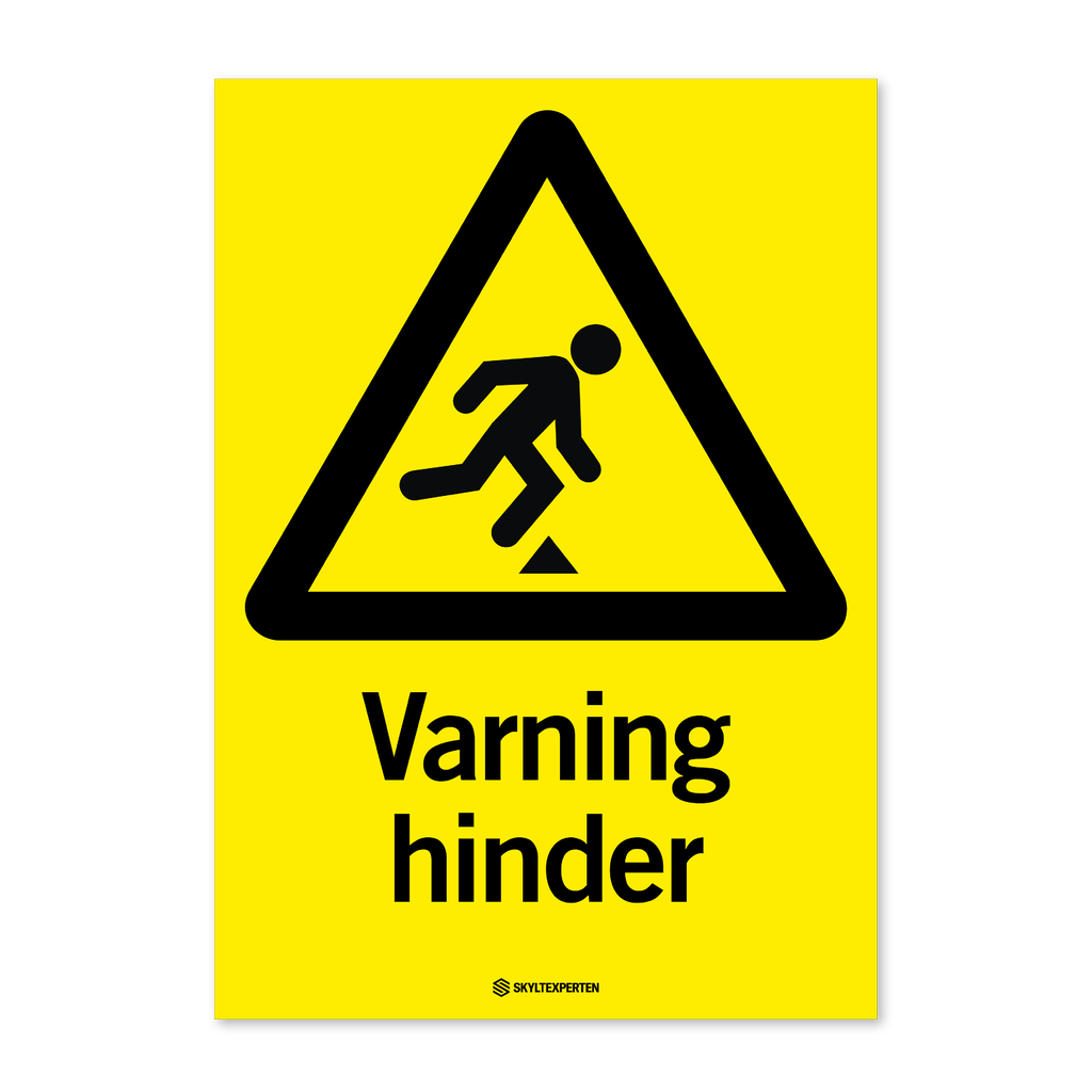 Skylt med texten Varning hinder. Skylten finns i aluminium (plan), plast, klisterdekal och som kantvikt aluminium för stolpmontage. Möjlighet finns att lägga till dubbelhäftande tejp eller skruvhål som fästmetod på skyltarna i aluminium (plan) och plast.
