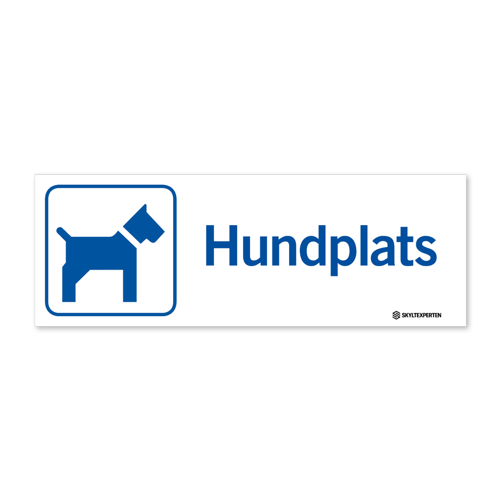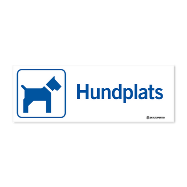Skylt med texten Hundplats. Skylten finns i aluminium (plan), plast, klisterdekal och som kantvikt aluminium för stolpmontage. Möjlighet finns att lägga till dubbelhäftande tejp eller skruvhål som fästmetod på skyltarna i aluminium (plan) och plast.