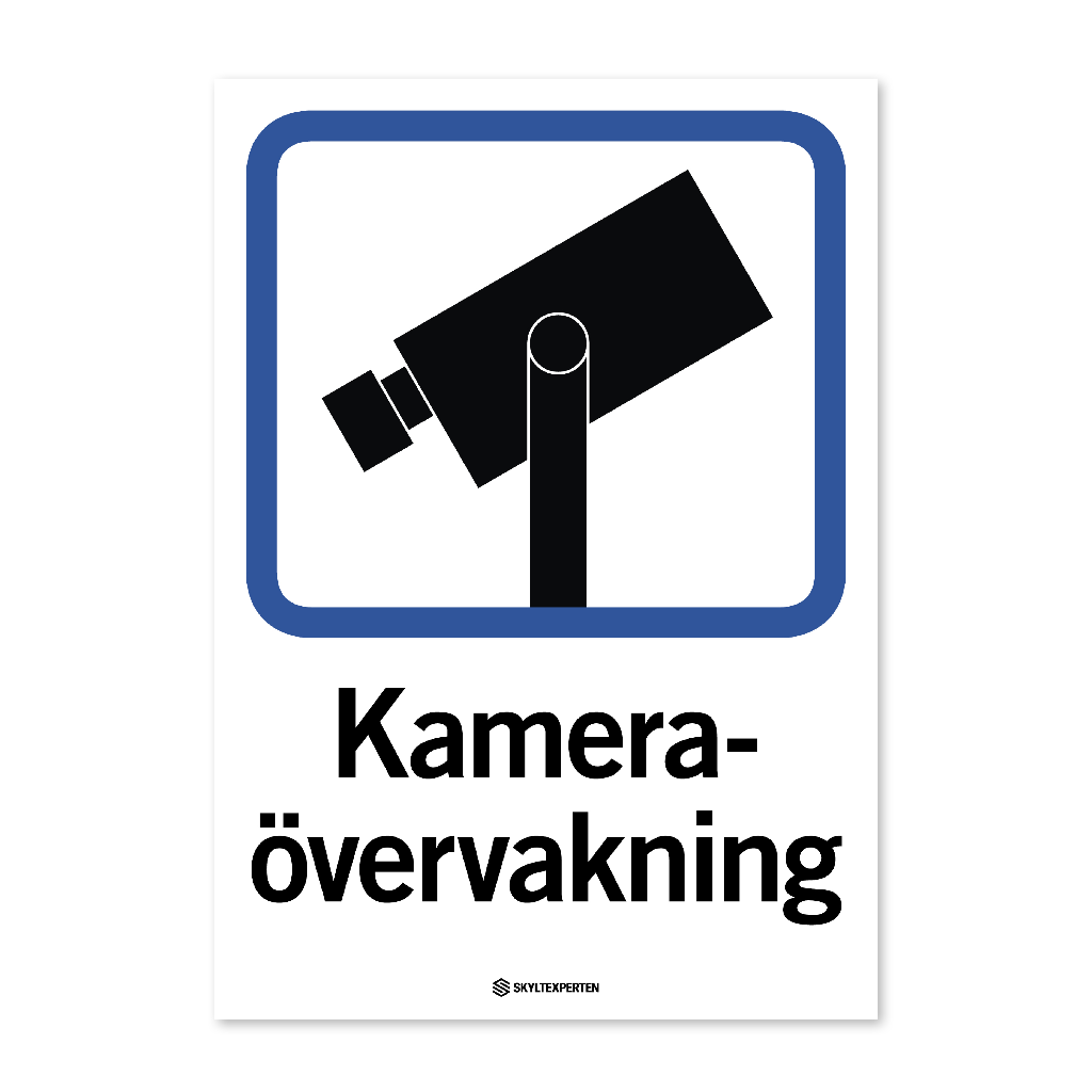 Skylt med texten Kameraövervakning. Skylten finns i aluminium (plan), plast, klisterdekal och som kantvikt aluminium för stolpmontage. Möjlighet finns att lägga till dubbelhäftande tejp eller skruvhål som fästmetod på skyltarna i aluminium (plan) och plast.
