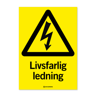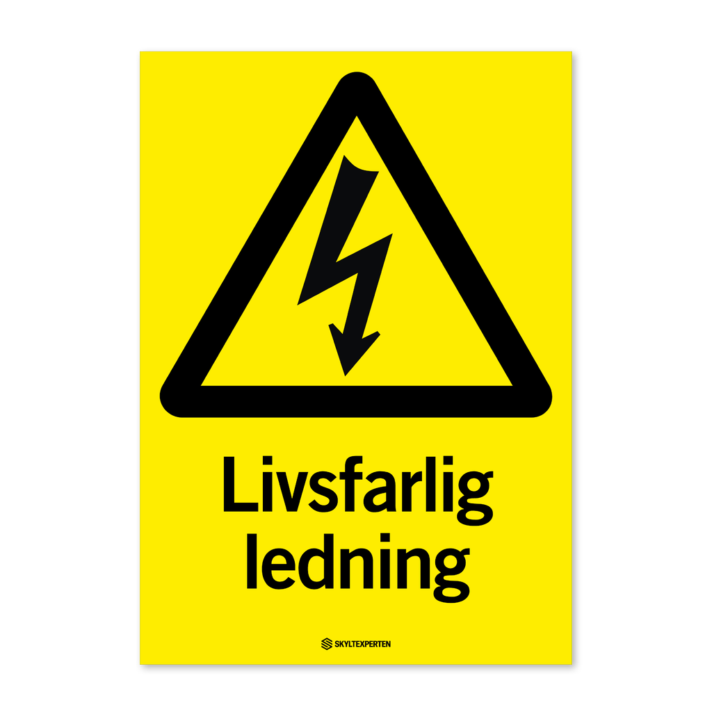 Skylt med texten Livsfarlig ledning. Skylten finns i aluminium (plan), plast, klisterdekal och som kantvikt aluminium för stolpmontage. Möjlighet finns att lägga till dubbelhäftande tejp eller skruvhål som fästmetod på skyltarna i aluminium (plan) och plast.