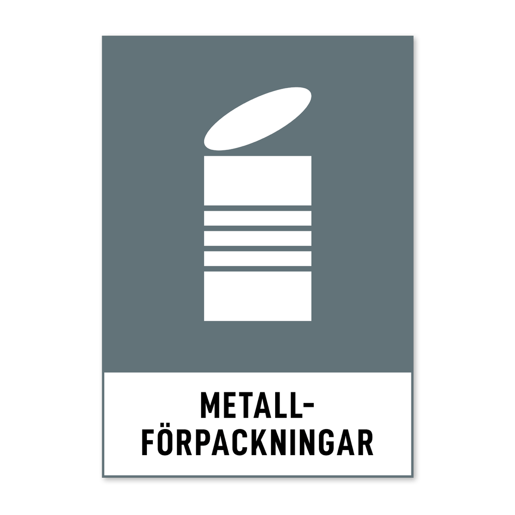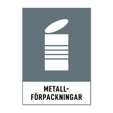 Skylt med texten Metallförpackningar. Skylten finns i aluminium (plan), plast, klisterdekal och som kantvikt aluminium för stolpmontage. Möjlighet finns att lägga till dubbelhäftande tejp eller skruvhål som fästmetod på skyltarna i aluminium (plan) och plast.
