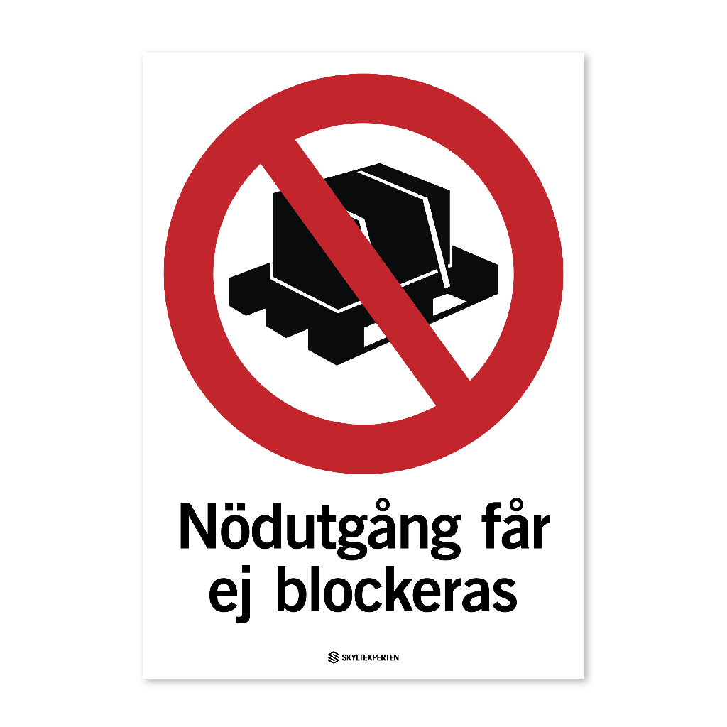 Skylt med texten Nödutgång får ej blockeras. Skylten finns i aluminium (plan), plast, klisterdekal och som kantvikt aluminium för stolpmontage. Möjlighet finns att lägga till dubbelhäftande tejp eller skruvhål som fästmetod på skyltarna i aluminium (plan) och plast.