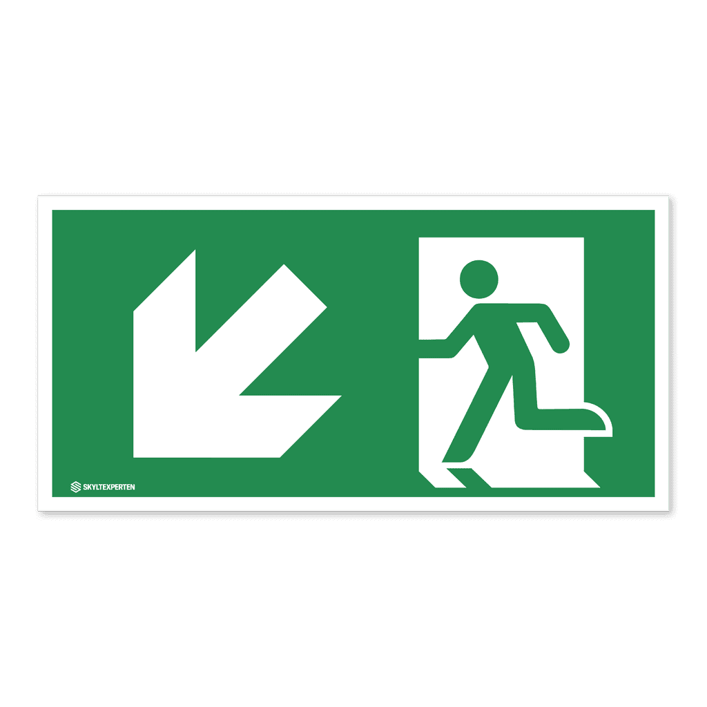 Skylt med nödutgångssymbol och pil som pekar snett nedåt åt vänster. Skylten finns i aluminium (plan), plast, klisterdekal och som kantvikt aluminium för stolpmontage. Möjlighet finns att lägga till dubbelhäftande tejp eller skruvhål som fästmetod på skyltarna i aluminium (plan) och plast.