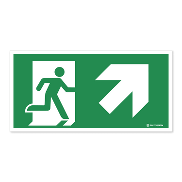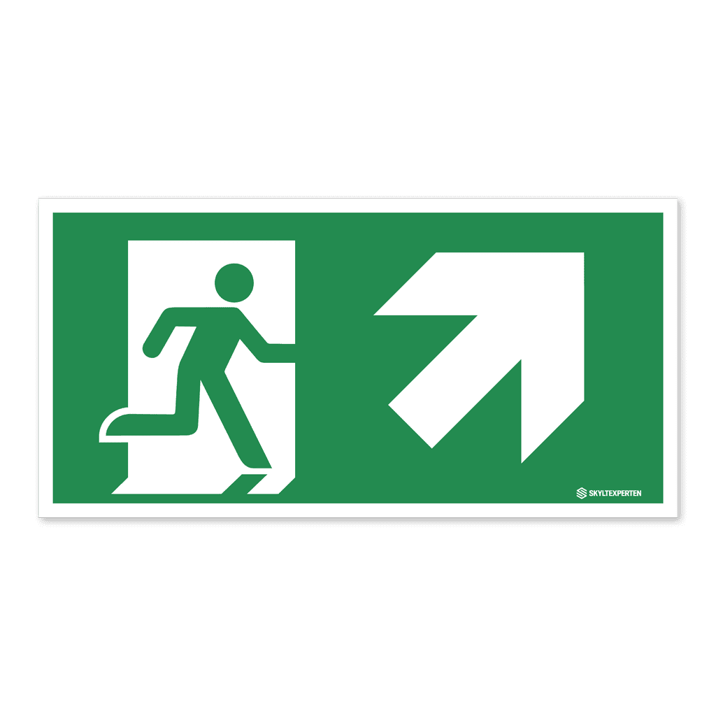 Skylt med nödutgångssymbol och pil som pekar snett uppåt åt höger. Skylten finns i aluminium (plan), plast, klisterdekal och som kantvikt aluminium för stolpmontage. Möjlighet finns att lägga till dubbelhäftande tejp eller skruvhål som fästmetod på skyltarna i aluminium (plan) och plast.