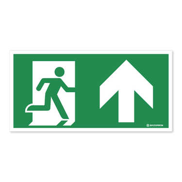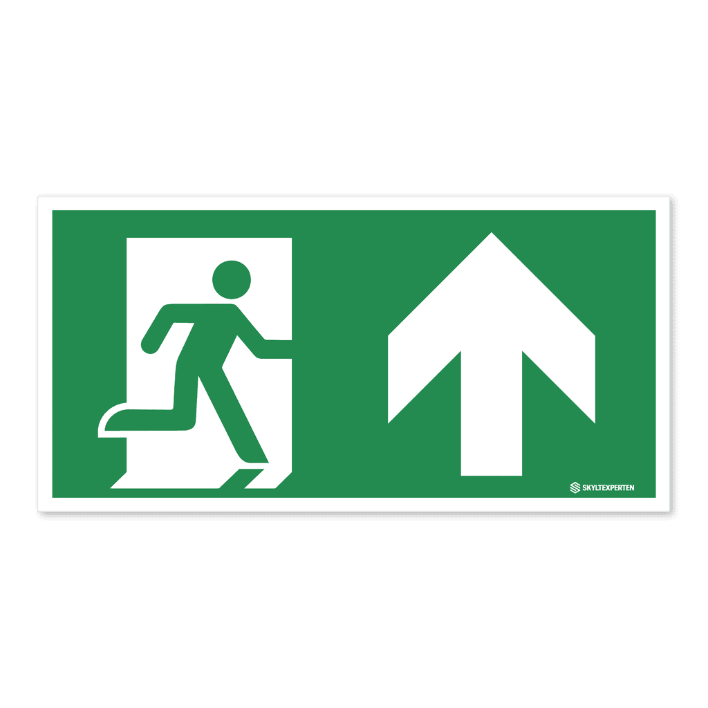 Skylt med nödutgångssymbol och pil som pekar uppåt. Skylten finns i aluminium (plan), plast, klisterdekal och som kantvikt aluminium för stolpmontage. Möjlighet finns att lägga till dubbelhäftande tejp eller skruvhål som fästmetod på skyltarna i aluminium (plan) och plast.