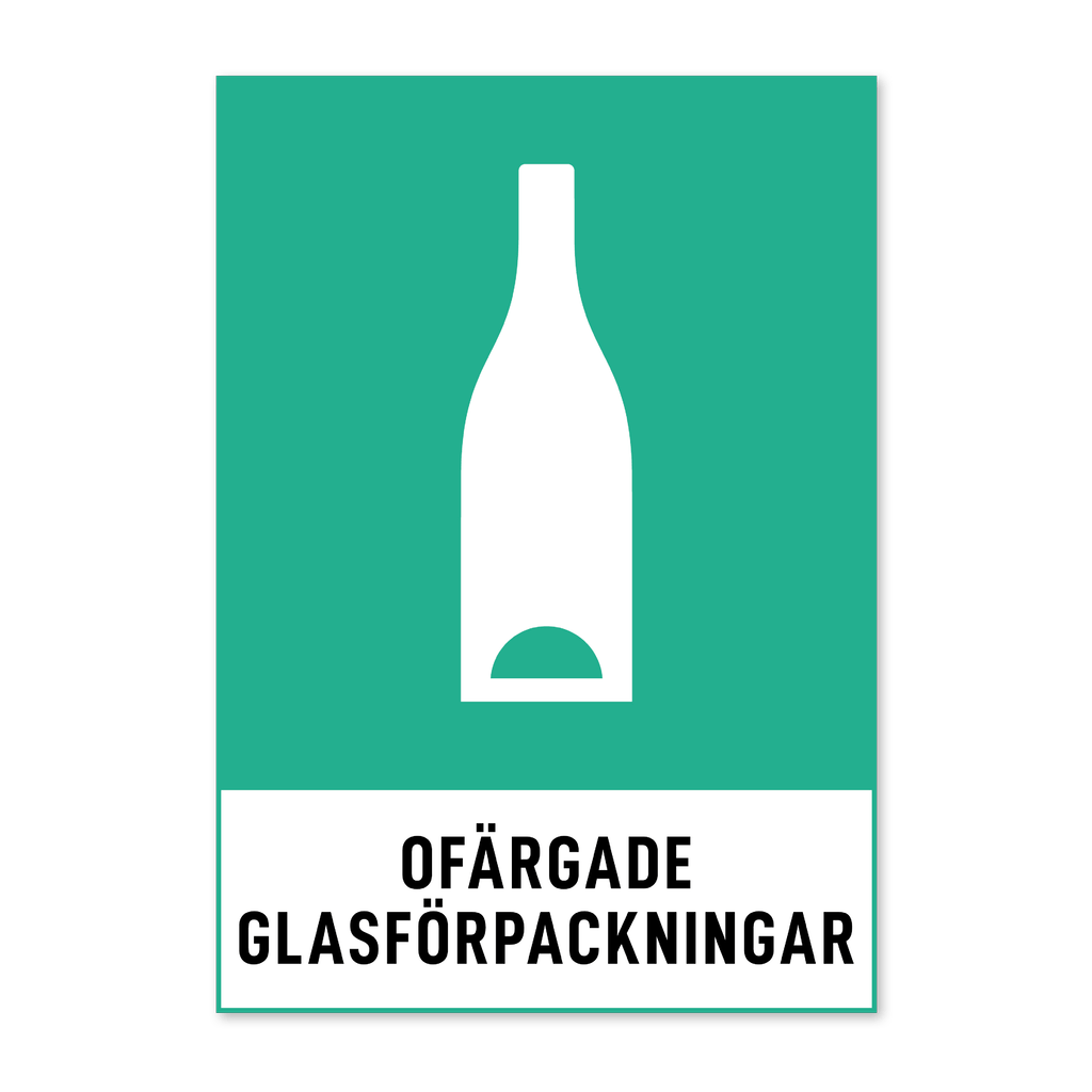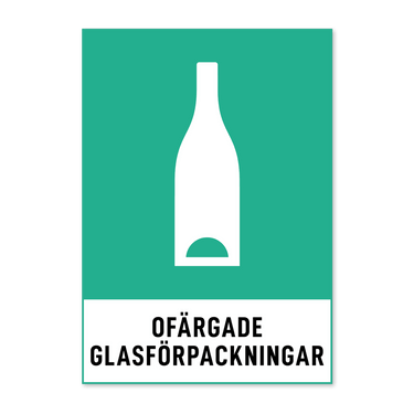 Skylt med texten Ofärgade glasförpackningar. Skylten finns i aluminium (plan), plast, klisterdekal och som kantvikt aluminium för stolpmontage. Möjlighet finns att lägga till dubbelhäftande tejp eller skruvhål som fästmetod på skyltarna i aluminium (plan) och plast.