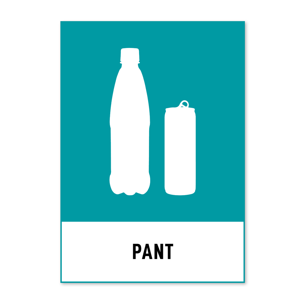 Skylt med texten Pant. Skylten finns i aluminium (plan), plast, klisterdekal och som kantvikt aluminium för stolpmontage. Möjlighet finns att lägga till dubbelhäftande tejp eller skruvhål som fästmetod på skyltarna i aluminium (plan) och plast.