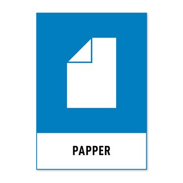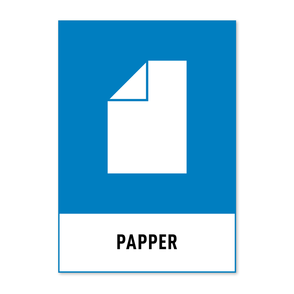 Skylt med texten Papper. Skylten finns i aluminium (plan), plast, klisterdekal och som kantvikt aluminium för stolpmontage. Möjlighet finns att lägga till dubbelhäftande tejp eller skruvhål som fästmetod på skyltarna i aluminium (plan) och plast.