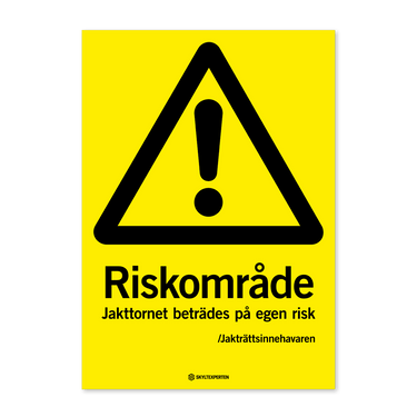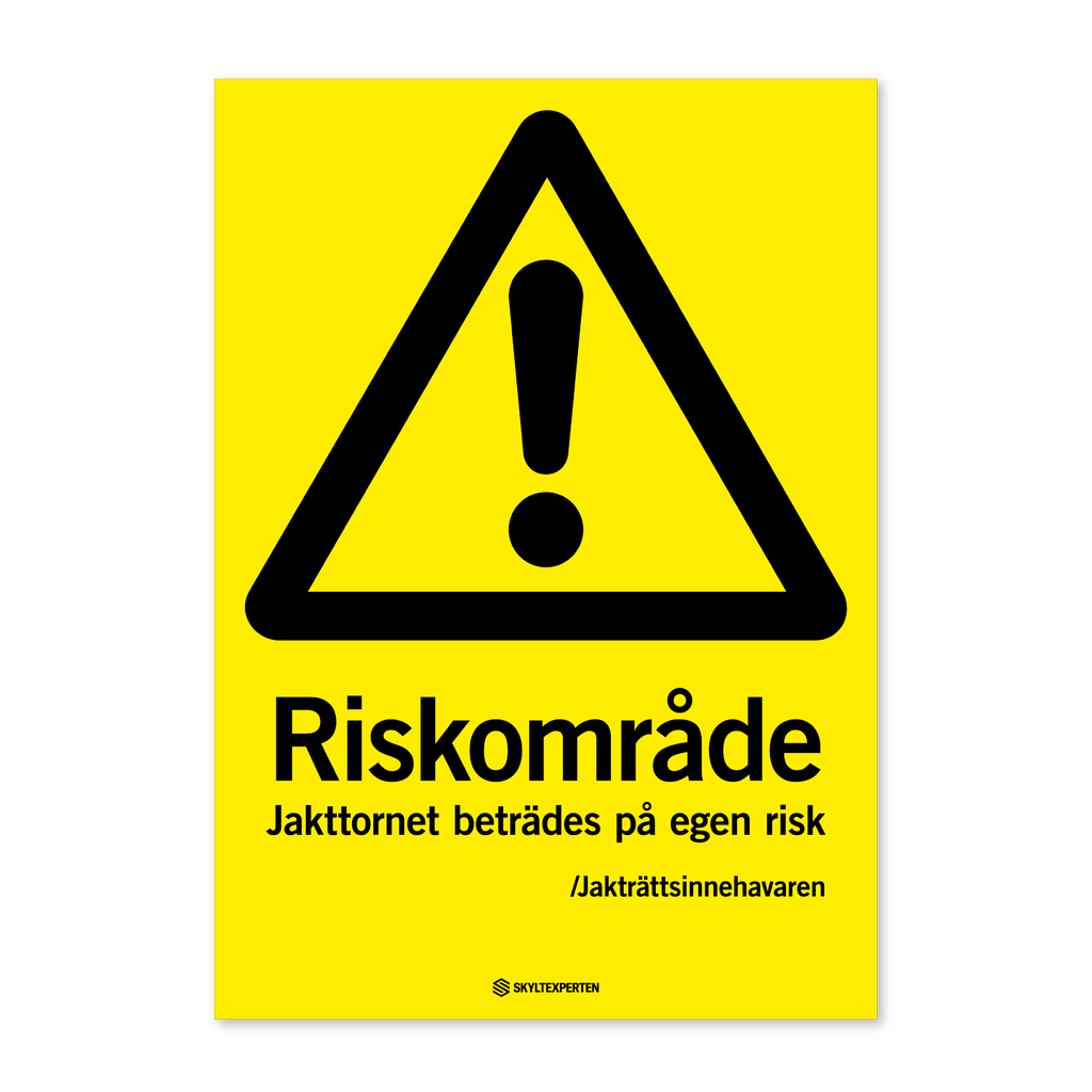 Skylt med texten Riskområde Jakttornet beträdes på egen risk /Jakträttsinnehavaren. Skylten finns i aluminium (plan), plast, klisterdekal och som kantvikt aluminium för stolpmontage. Möjlighet finns att lägga till dubbelhäftande tejp eller skruvhål som fästmetod på skyltarna i aluminium (plan) och plast.