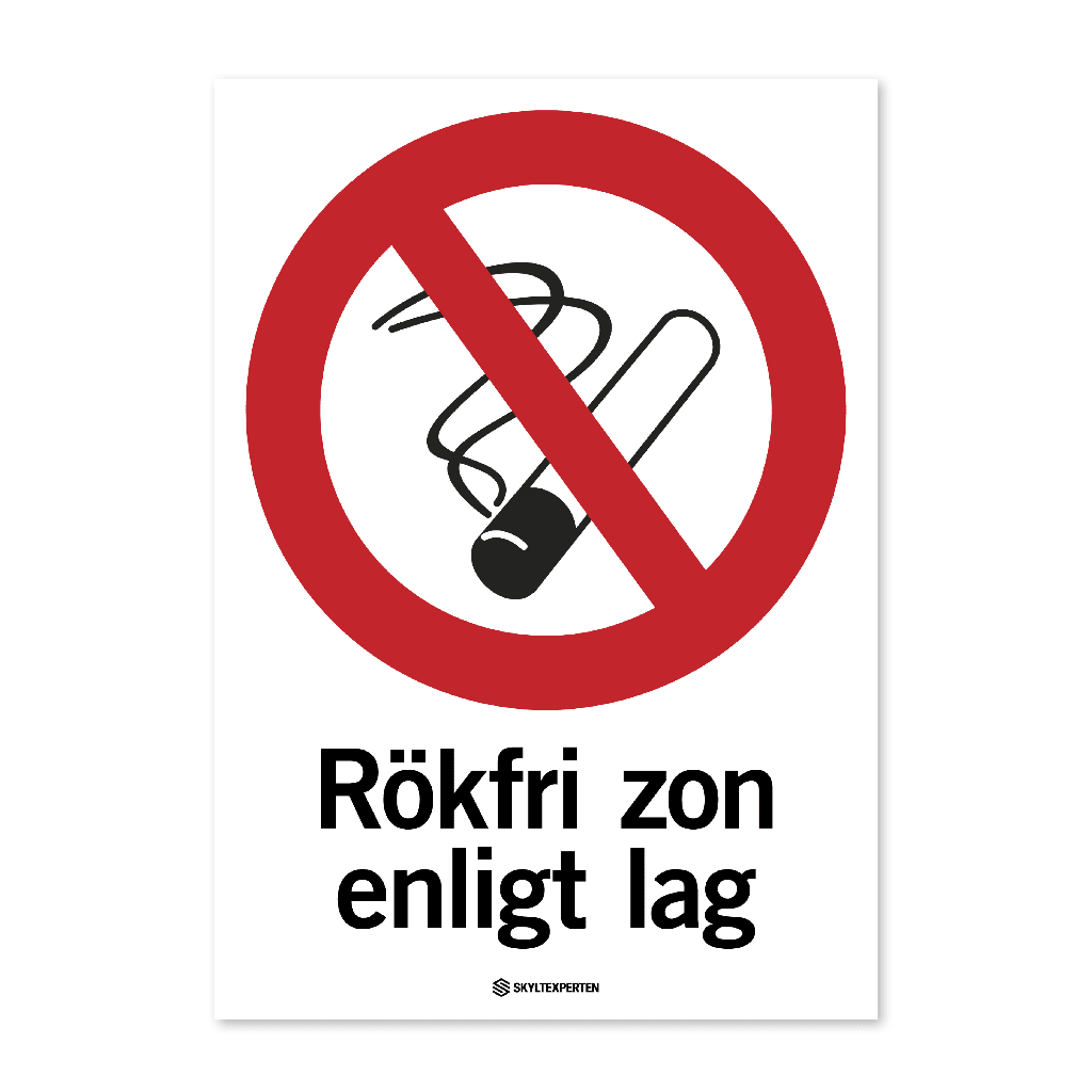 Skylt med texten Rökfri zon enligt lag. Skylten finns i aluminium (plan), plast, klisterdekal och som kantvikt aluminium för stolpmontage. Möjlighet finns att lägga till dubbelhäftande tejp eller skruvhål som fästmetod på skyltarna i aluminium (plan) och plast.