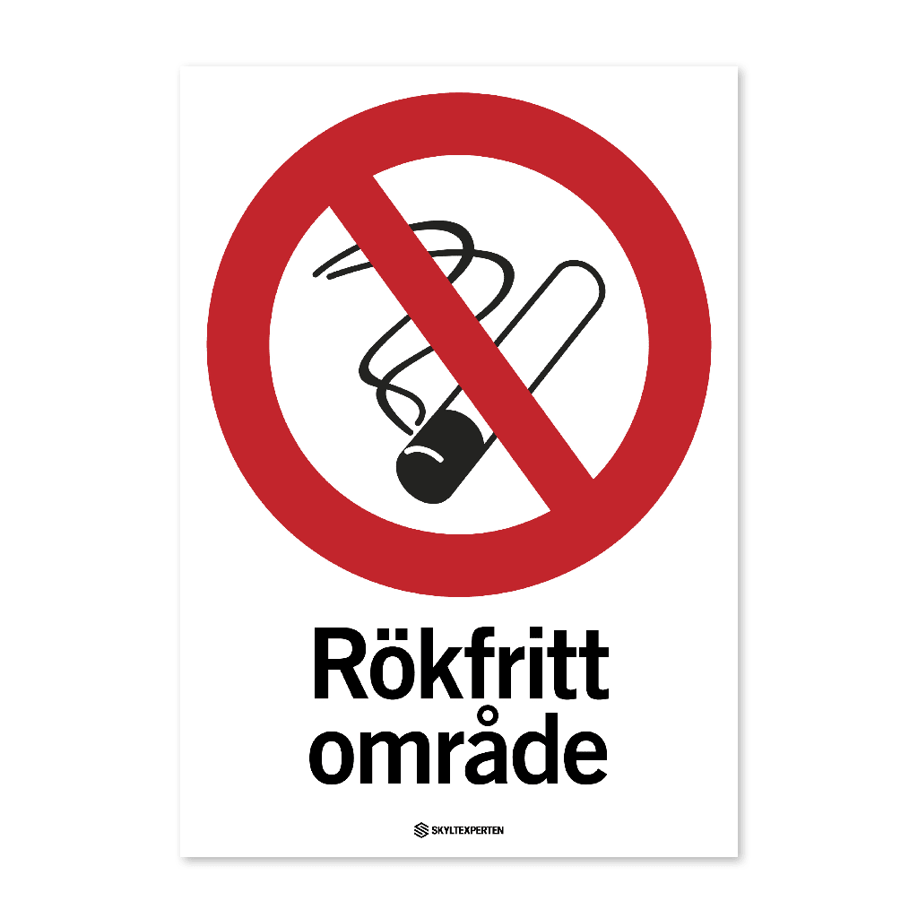 Skylt med texten Rökfritt område. Skylten finns i aluminium (plan), plast, klisterdekal och som kantvikt aluminium för stolpmontage. Möjlighet finns att lägga till dubbelhäftande tejp eller skruvhål som fästmetod på skyltarna i aluminium (plan) och plast.