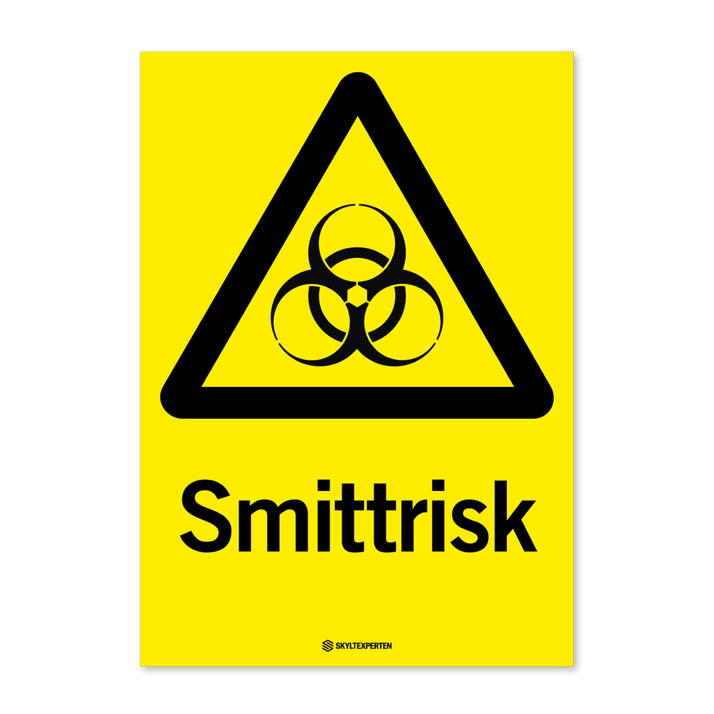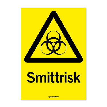 Skylt med texten Smittrisk. Skylten finns i aluminium (plan), plast, klisterdekal och som kantvikt aluminium för stolpmontage. Möjlighet finns att lägga till dubbelhäftande tejp eller skruvhål som fästmetod på skyltarna i aluminium (plan) och plast.