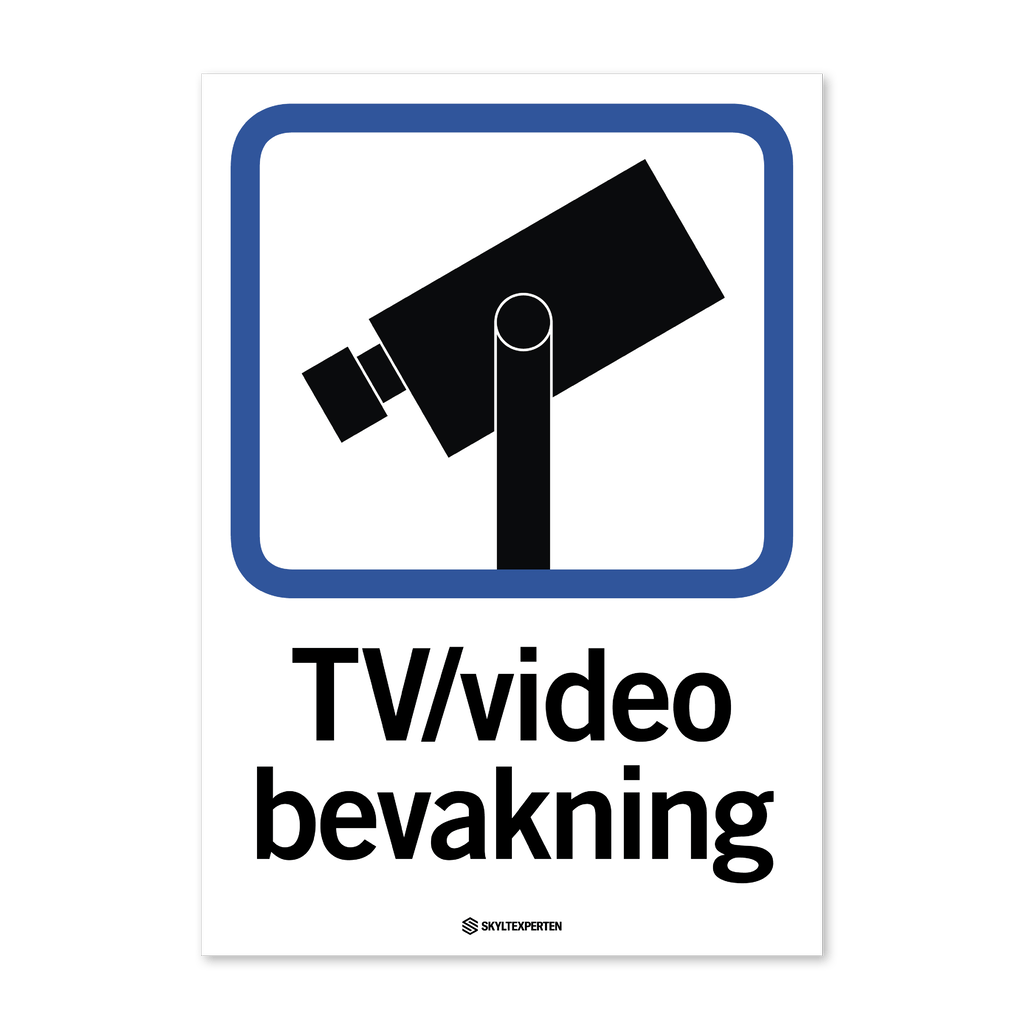 Skylt med texten TV/Videobevakning. Skylten finns i aluminium (plan), plast, klisterdekal och som kantvikt aluminium för stolpmontage. Möjlighet finns att lägga till dubbelhäftande tejp eller skruvhål som fästmetod på skyltarna i aluminium (plan) och plast.