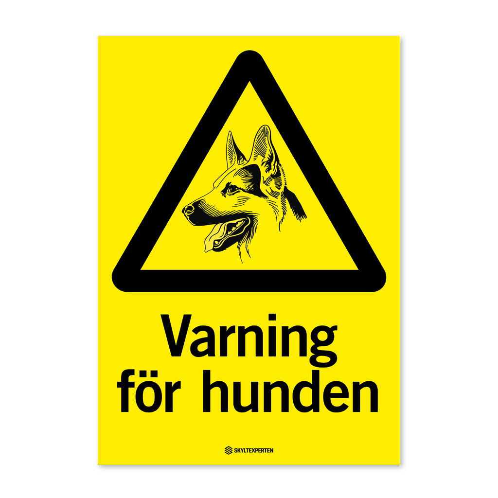 Skylt med texten Varning för hunden. Skylten finns i aluminium (plan), plast, klisterdekal och som kantvikt aluminium för stolpmontage. Möjlighet finns att lägga till dubbelhäftande tejp eller skruvhål som fästmetod på skyltarna i aluminium (plan) och plast.