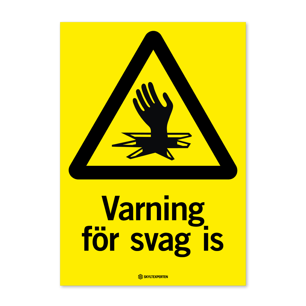 Skylt med texten Varning för svag is. Skylten finns i aluminium (plan), plast, klisterdekal och som kantvikt aluminium för stolpmontage. Möjlighet finns att lägga till dubbelhäftande tejp eller skruvhål som fästmetod på skyltarna i aluminium (plan) och plast.