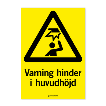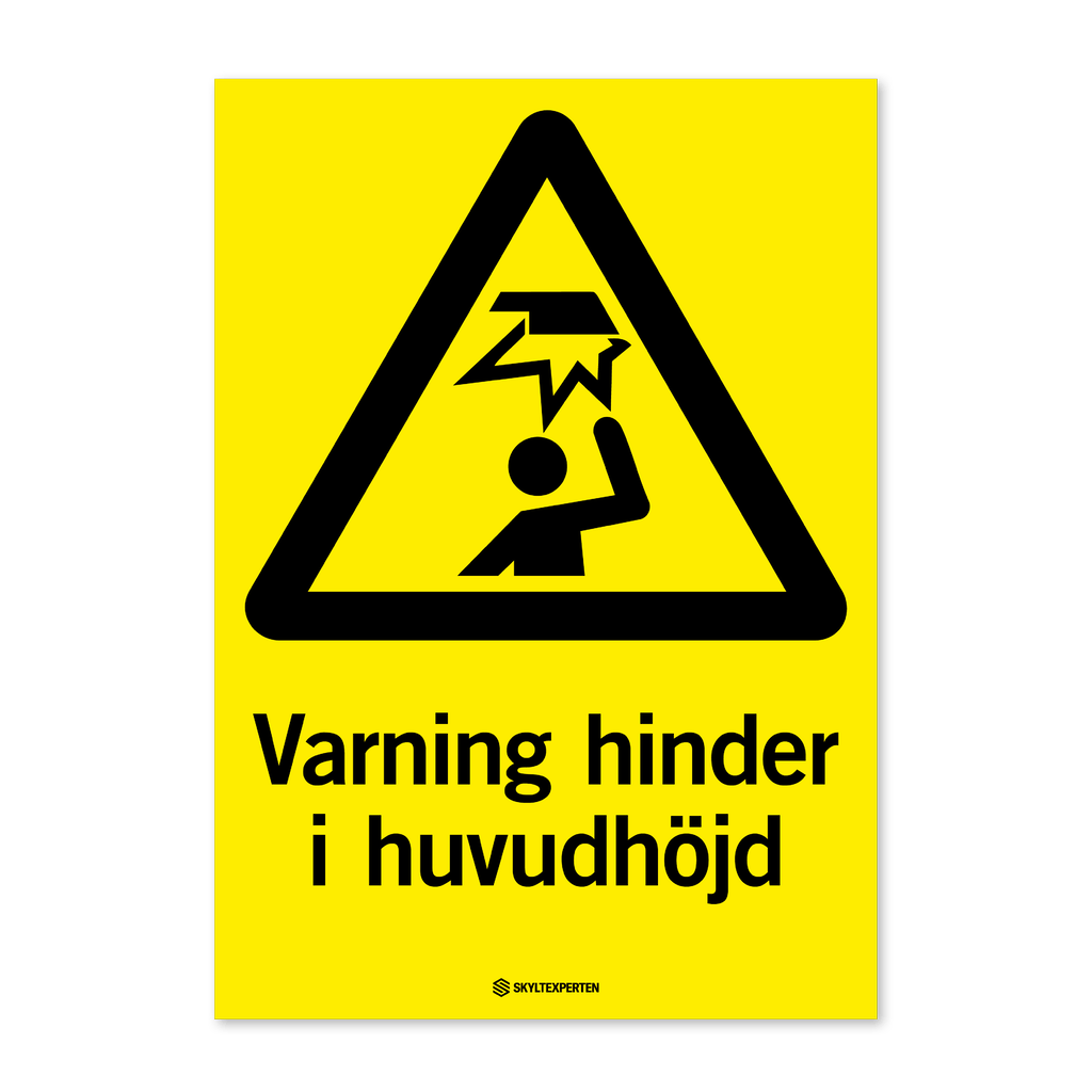 Skylt med texten Varning hinder i huvudhöjd. Skylten finns i aluminium (plan), plast, klisterdekal och som kantvikt aluminium för stolpmontage. Möjlighet finns att lägga till dubbelhäftande tejp eller skruvhål som fästmetod på skyltarna i aluminium (plan) och plast.