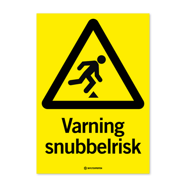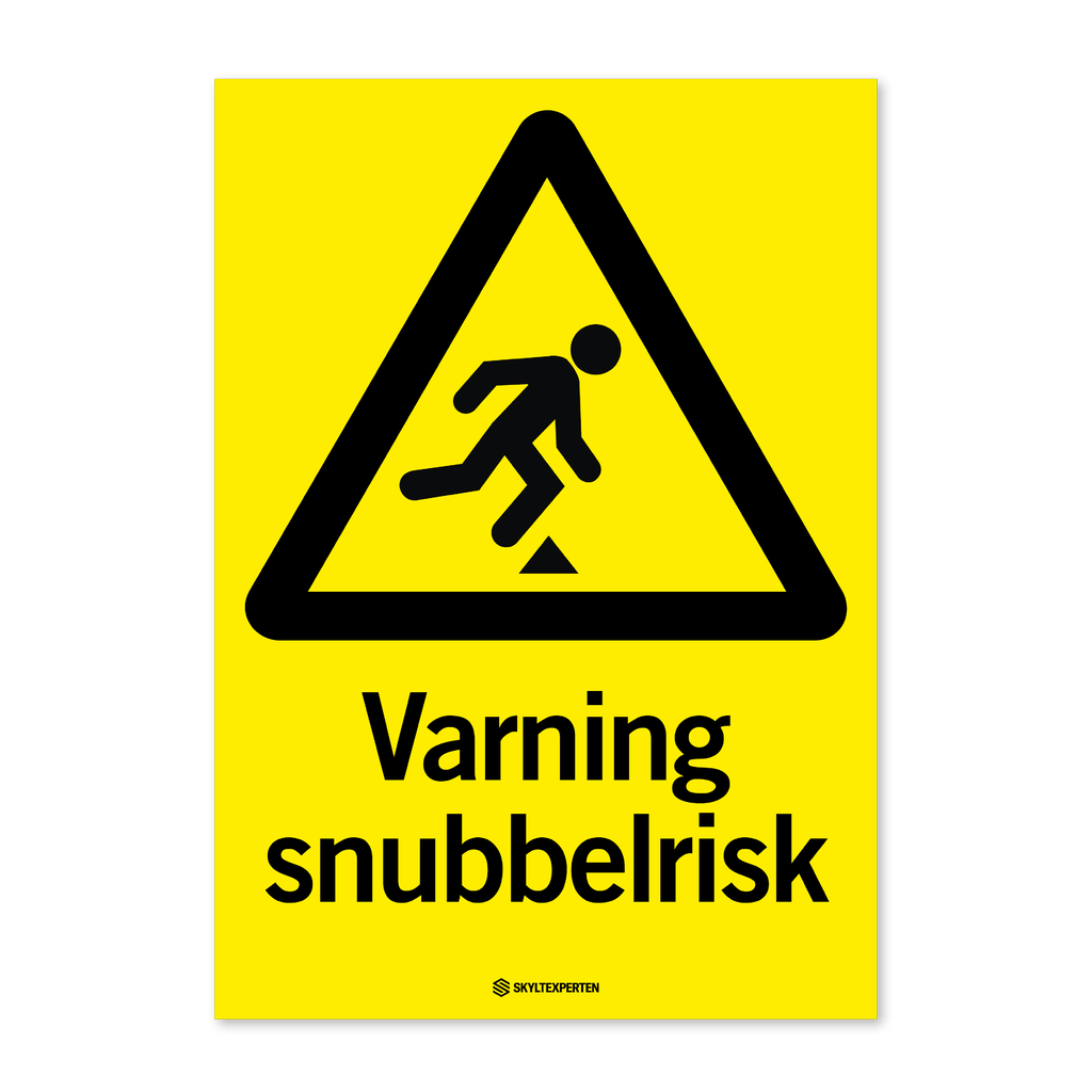 Skylt med texten Varning snubbelrisk. Skylten finns i aluminium (plan), plast, klisterdekal och som kantvikt aluminium för stolpmontage. Möjlighet finns att lägga till dubbelhäftande tejp eller skruvhål som fästmetod på skyltarna i aluminium (plan) och plast.